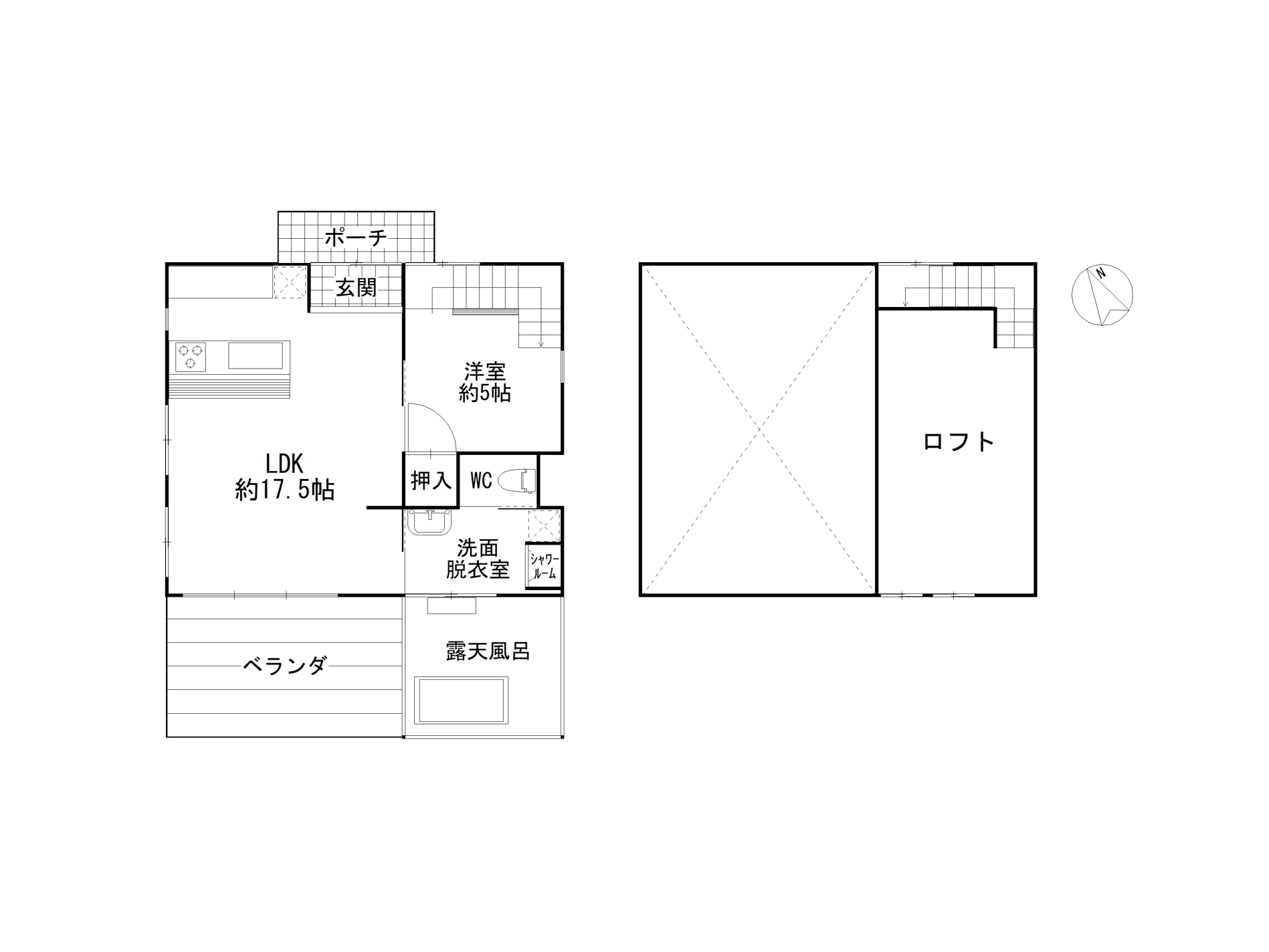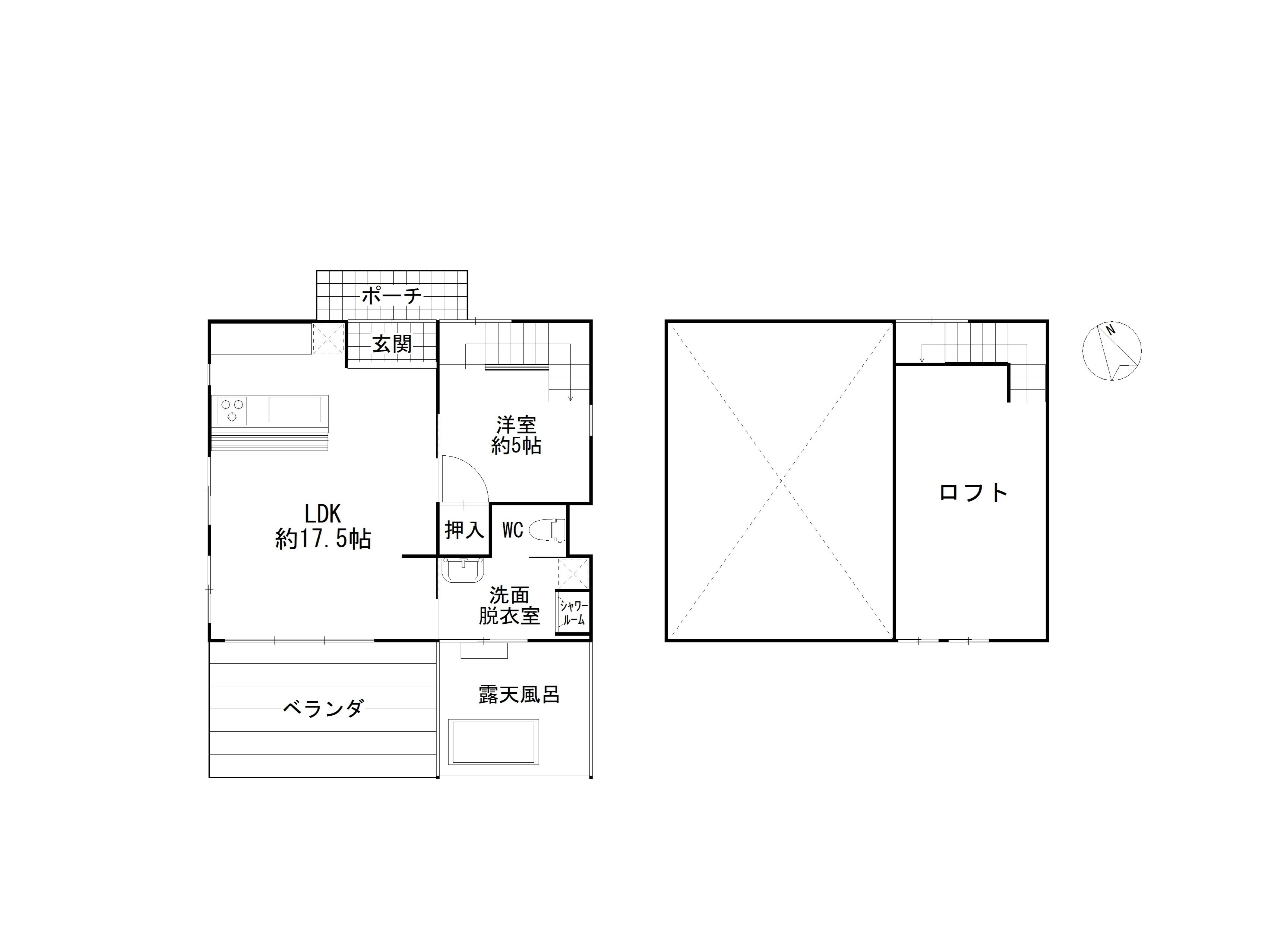 1F:LDK17 洋5 ロフト 洗面脱衣室 トイレ ウッドデッキ 露天風呂