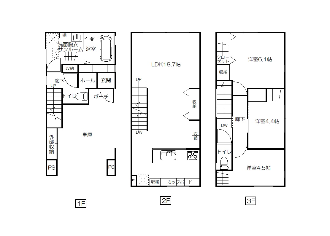3LDK/1F:洗面 浴室 水洗 車庫 2F:LDK18.7 3F:寝室6.1 洋4.6 洋4.5 水洗